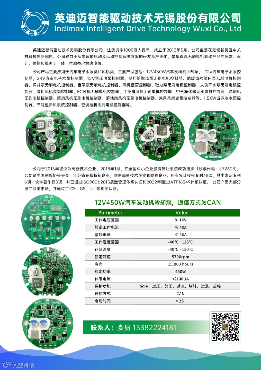 英迪迈智能驱动技术无锡股份有限公司,注册资本2341万人民币,成立于2012年5月,公司坐落在无锡新吴区坤鼎未来智造园内,公司致力于从事智能驱动及运动控制解决方案的研发及产业化,是集汽车电子水泵驱动及直流无刷电机驱动产品的研发、设计、销售和服务于一体,帮助客户解决电机驱动方案并提供成套产品驱动器的高新技术企业。