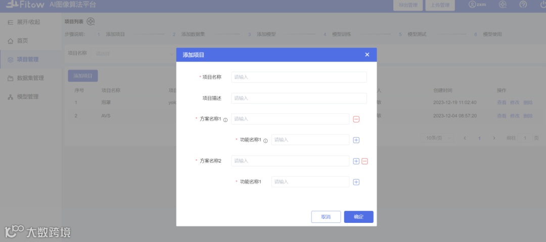 11. 项目管理功能:允许在AI图像算法平台中创建和管理不同的项目,每个项目可以关联自己的数据集,并且提供了添加项目的功能。可以轻松地组织和管理不同的任务和数据集,使其在平台上进行更加灵活和高效的项目中的模型和版本。