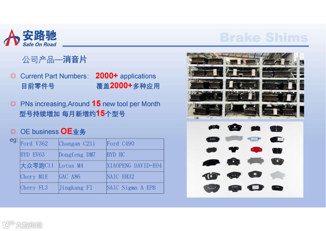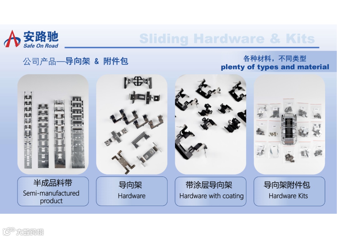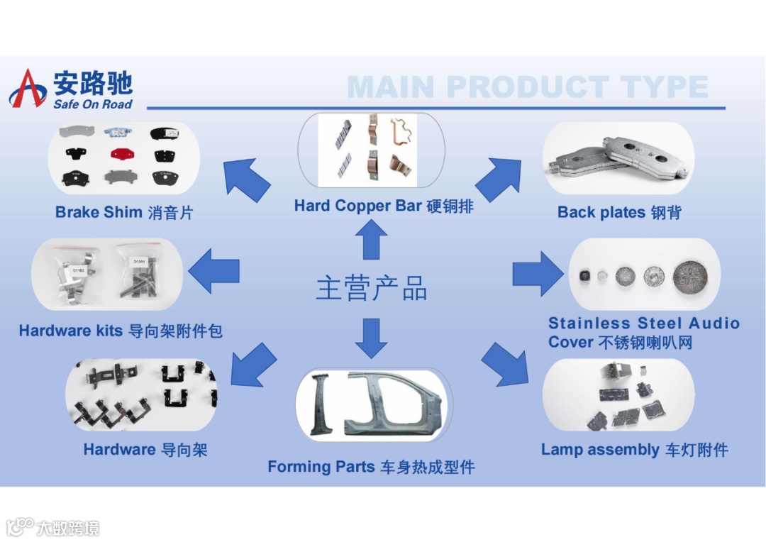 安路驰是一家专业的开发、制造和销售各类汽车零部件的供应商,主要生产制动、转向、车灯、内外饰、电机及相关冲压产品。同时拥有独立的模具设计开发和加工能力,可快速响应市场需求。生产采用高效自动化连续冲压线,配备专业检测设备,主要产品包括消音片、导向架、钢背、不锈钢喇叭罩、电机外壳附件以及车灯罩附件等。公司面向全球市场,同时开展OE和售后业务,致力于成为国际化的高端汽车零部件供应商,为更多客户提供优质产品和服务。