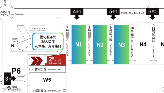 乘地铁7号线至花木路站从1号口出即可抵达新国际博览中心2号入口厅