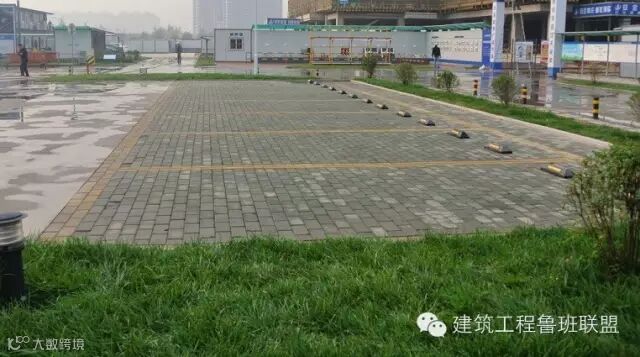 停车位:广场砖、草坪砖铺设整齐,黄色分割线和档杆设置到位,并与绿化有机结合。