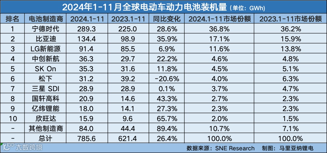 中国企业方面,2024年1-11月,6家企业装机量总计514.8GWh,市场份额达65.5%。