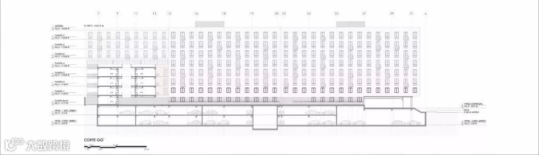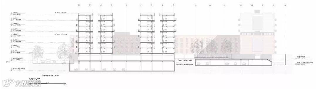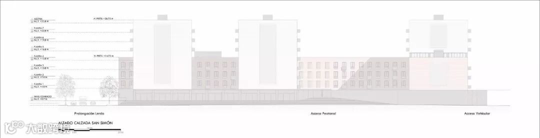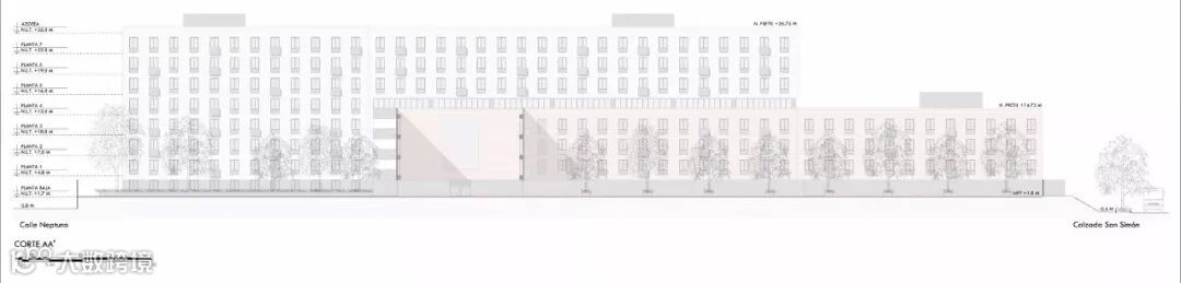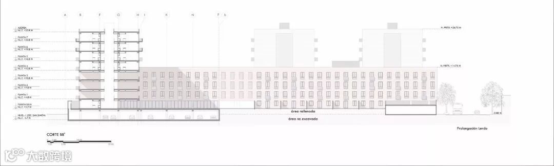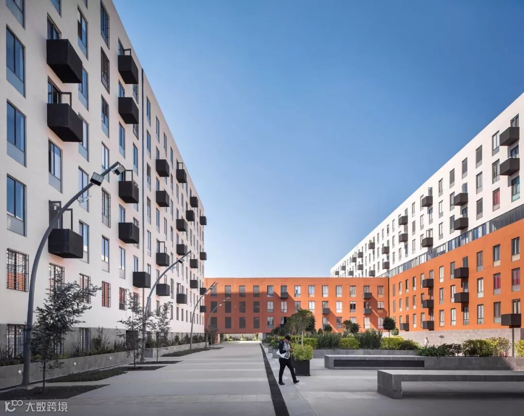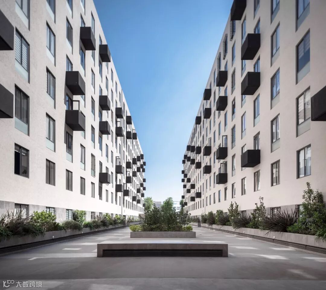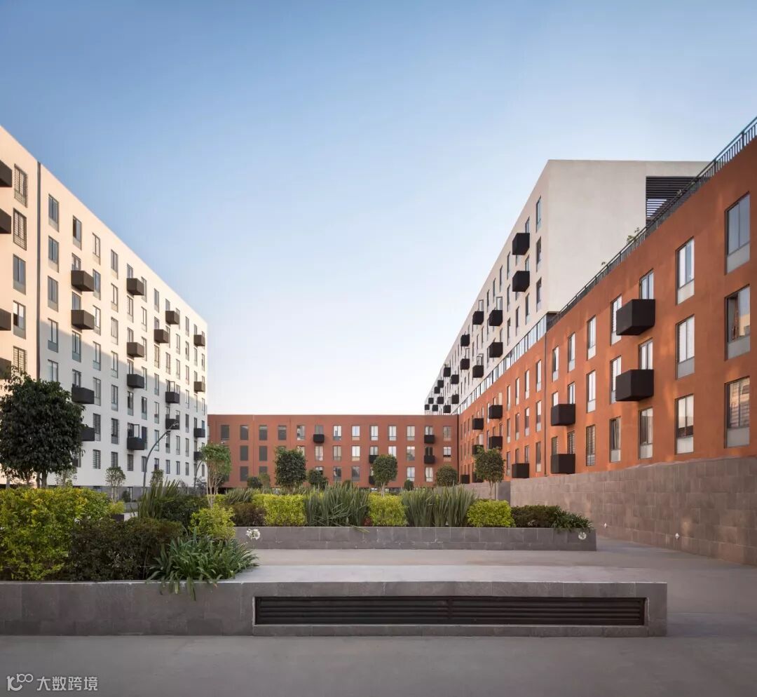 这是Consorcio Ara公司委托,推广和建造的多户住宅项目。Weber建筑设计的方案旨在优先考虑公共区域,并通过其体量将14,000平方米的地块分成三个大庭院。中央庭院约4,000平方米,带有一组长椅和花坛,后面的第二个庭院用于容纳带有运动区,游乐场和公园的娱乐区,另一个庭院用于将两栋白色的建筑隔开。
