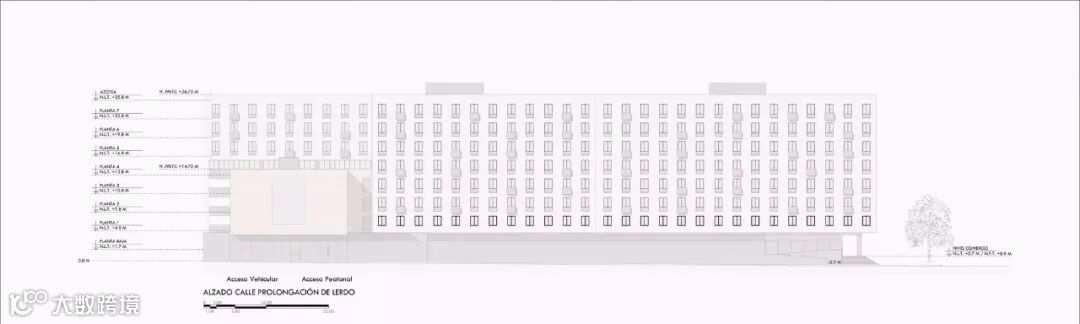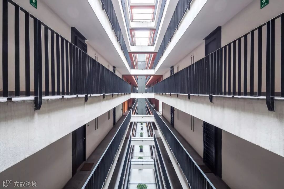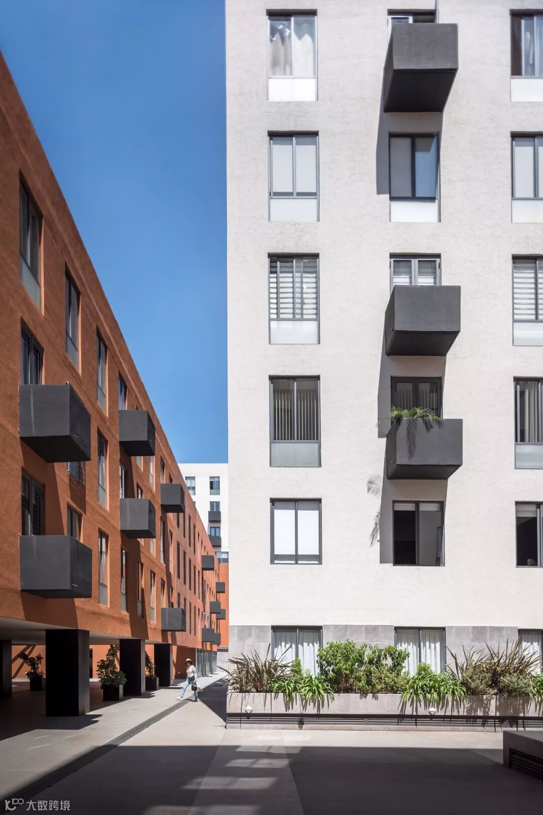 The complex consisting of 531 homes is divided by white buildings that contain the largest apartments of 60 m2 and the terracotta that houses those of 55 m2. The white prism ends before reaching the street of Lerdo to offer a large roof garden, seeming to float over the terracotta volume, which brings a feeling of lightness