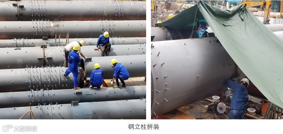 (4)钢柱安装垂直度控制偏差要求≤1/1000,不得大于35mm,钢柱垂直度要求非常高,在全国逆作法范围尚属首例。在公司乃至局总部技术力量的大力支持下,项目团队昼夜攻关,研发并采用专用调垂装置,并通过严格的使用工艺流程控制,使得钢立柱安装垂直度最终达到了≤1/1000的精度,最高精度达到1/2400,是国内逆作法施工钢立柱安装的最高精度,并获得了行业媒体的广泛报道。