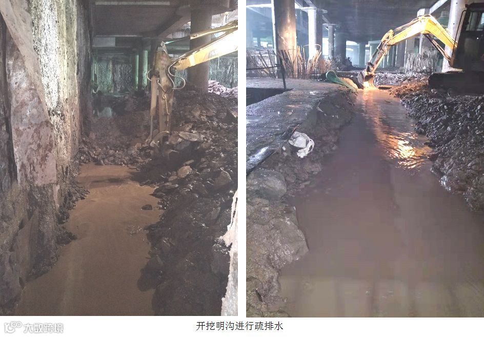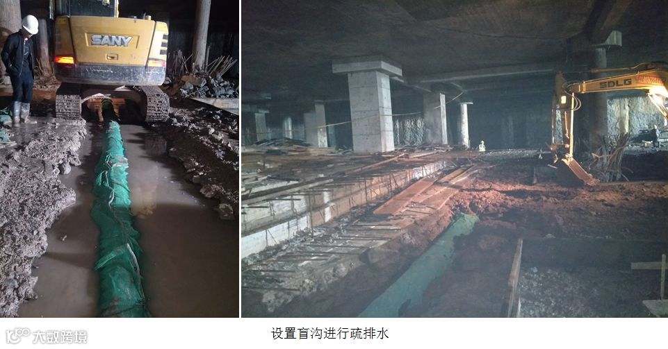 (2)土方暗挖挖机设备容易碰撞钢柱、预留插筋等,且闹市区土方开挖限时,夜间土方外运受城管堵门等影响,出土时间基本为凌晨12点以后,有效出土时间为5h,逆作法土方开挖难度和进度压力极大。