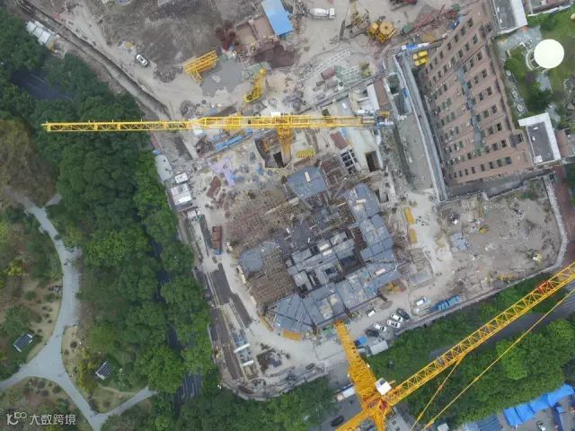 项目周边关系复杂:南方电网220KV超高压电缆横穿工地;广州市地铁6号线经过工程北塔楼施工区,横穿工地地下室;工地南侧紧邻广州重点保护文物——1908年建设完工的广州最早发电厂,二者相距不足2米;距离珠江黄金水道不足10米;施工场地极为狭小,施工红线已靠近四周市政道路,路边古树高达二三十米,西面正在使用的变电站和南面文物像两个方盒子嵌入工地内……开工之初便被业内人士评价为全国施工最复杂、难度最大城市综合体项目,不得不采用逆作法施工。