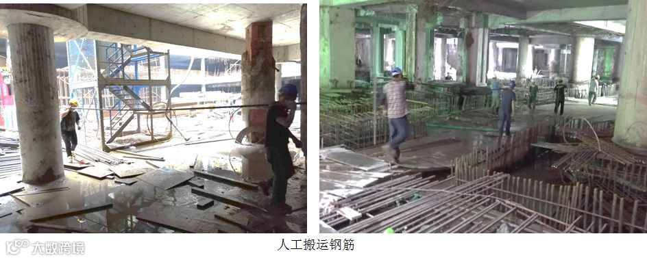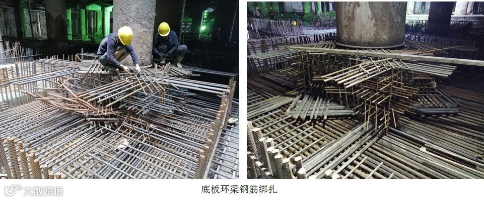 底板钢筋工程量大,且由于前期已封闭两个取土口,塔吊无法吊运材料,大量钢筋需通过人工从取土口位置搬运至现场进行安装。另有超过65%的钢柱与底板之间设置了环梁节点,且节点构造复杂,钢筋数量多,施工难度极大,工效极低。