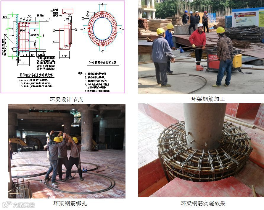 环梁结构钢筋最大直径32,平均为28,钢筋间距密度大。环梁圆弧形主筋加工、绑扎难度大,施工效率低。