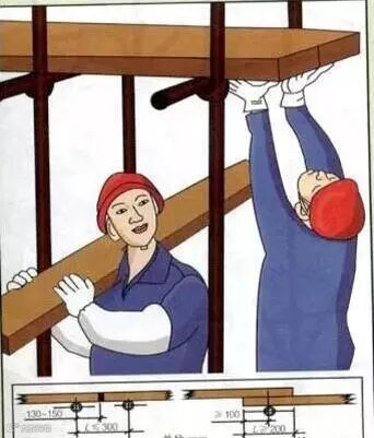 6.2.4脚手板的设置应符合下列规定:脚手板对接平铺时,接头处应设两根横向水平杆,脚手板外伸长度应取130mm~150mm,两块脚手板外伸长度的和不应大于300mm;脚手板搭接铺设时,接头应支在横向水平杆上,搭接长度不应小于200mm,其伸出横向水平杆的长度不应小于100mm。