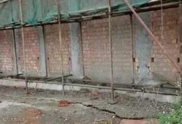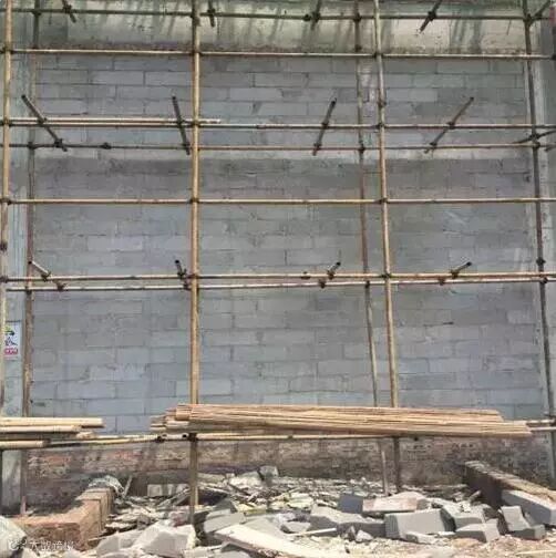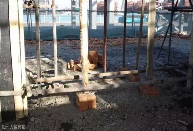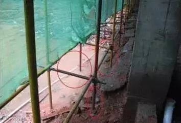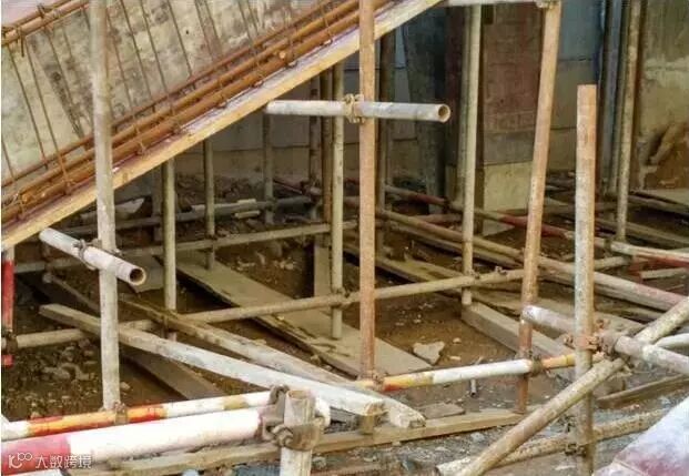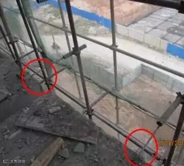 4、基础不夯实,平整,立杆下垫砖块,甚至悬空、垫板过薄、过短