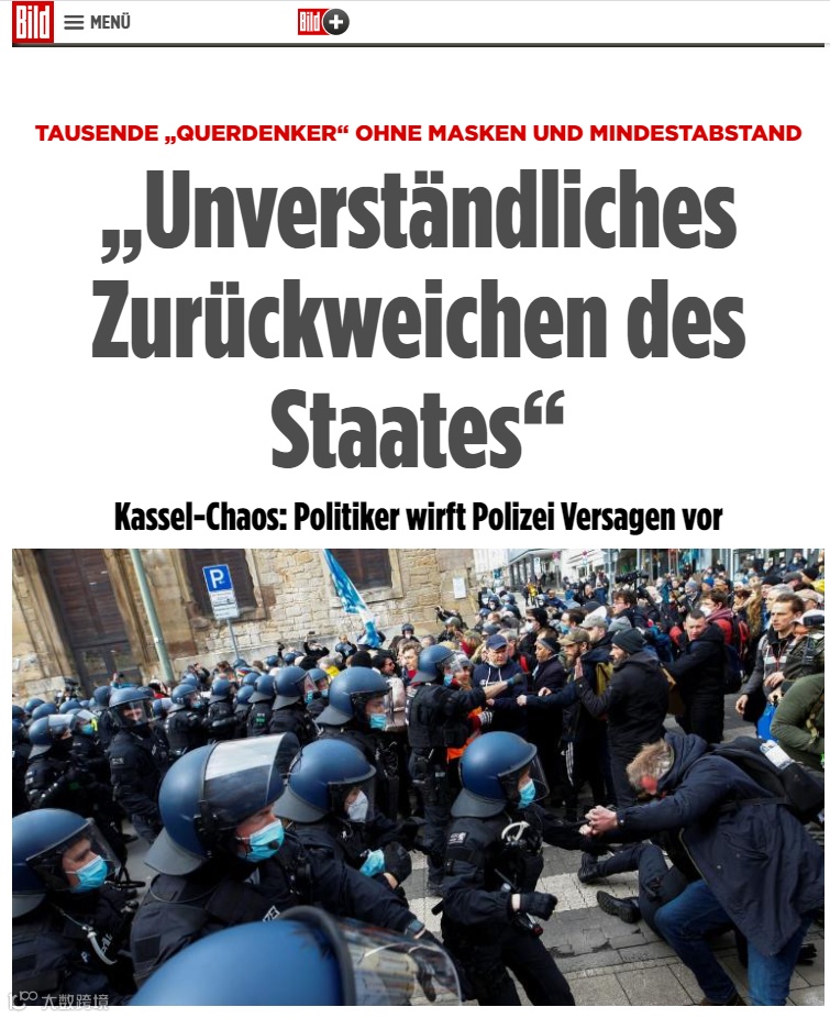 当地时间3月20日,德国黑森州卡塞尔市爆发大规模示威活动,以抗议防疫限制措施。期间,警方与示威者发生冲突,警方使用高压水枪、警棍和辣椒喷雾等驱离示威者。