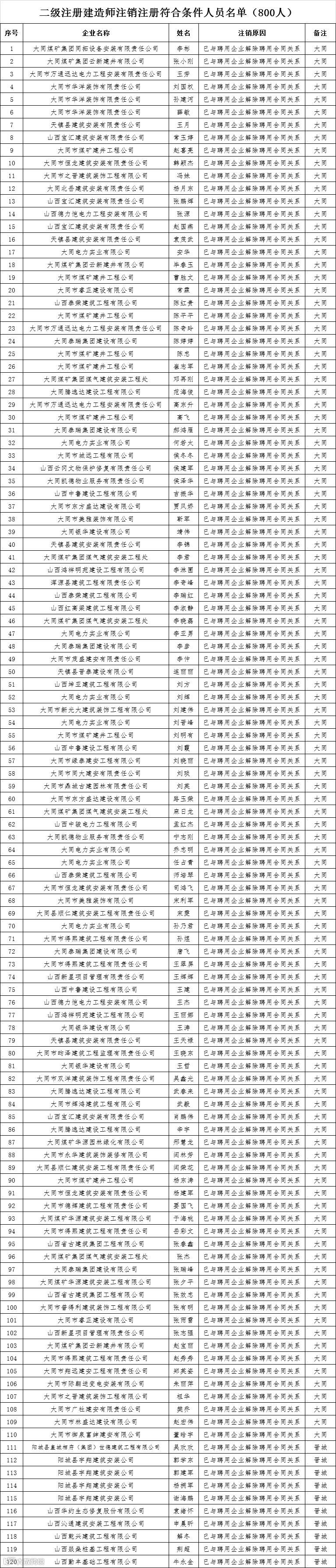 7月8日,山西省住建厅公布2019年第九批二级建造师注册结果,其中初始注册289人,注销注册800人。注销原因均为与聘用企业解除合同关系。