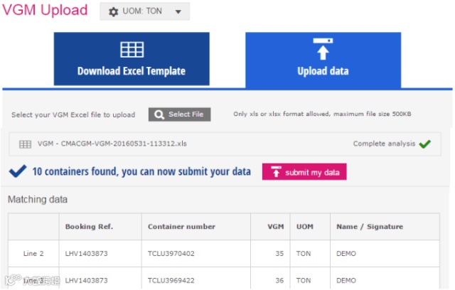 该平台符合验证总重量申报要求,将收集到的验证总重量、编辑并和码头共享数据。托运人可通过提交装运指令时提供验证总重量信息或单独提交申报。
