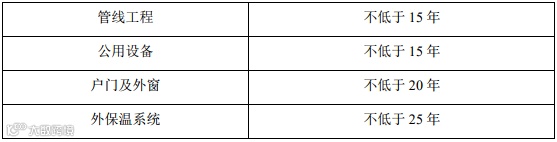 结构不低于50年,屋面防水不低于20年,卫生间防水不低于15年,地下工程防水不低于结构设计工作年限(即50年)。