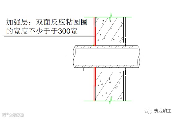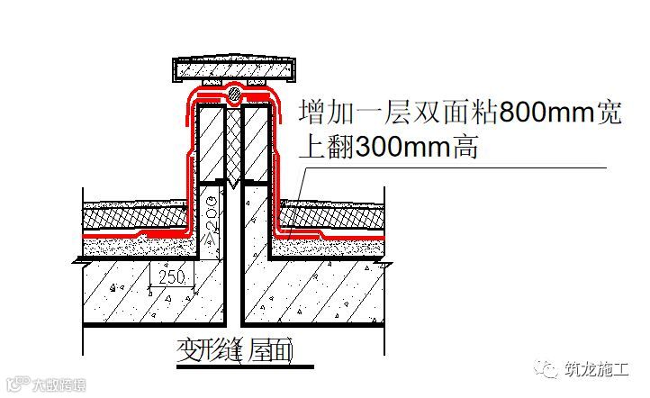 5)卷材沿立面墙,上翻300高,此位置用宽度为800MM的双面粘折成直角铺贴,水平面的反应粘压住双面粘。