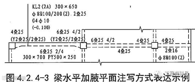 当梁设置水平加腋梁时,水平加腋内上下部斜纵筋应在加腋支座上部以Y打头注写在括号内,上下部斜纵筋之间用“/”分隔。