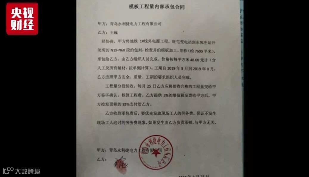 至于永利捷与下游企业继续进行分包的事宜,记者也获得了一份永利捷公司与下游公司签订的合同。而法律专家表示,从永利捷公司往下的一系列转包分包行为均涉嫌违法。