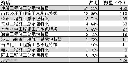 据统计,截至2018年底,全国特级资质数量达788个,分别归属于627家企业。建筑工程、公路工程、市政工程特级资质总量占最大份额,分别为450个、110个和108个,占特级资质总量约85%。