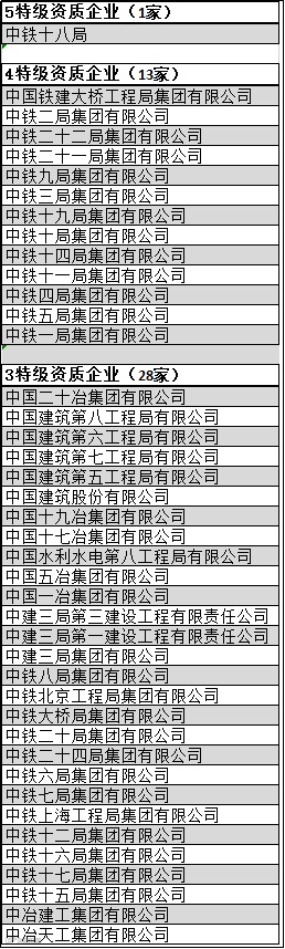 2018年,中国中铁系统新增特级资质25个,中国建筑系统新增特级资质3个,中国铁建和中国电建系统新增特级资质两个,中国交建系统新增特级资质1个。