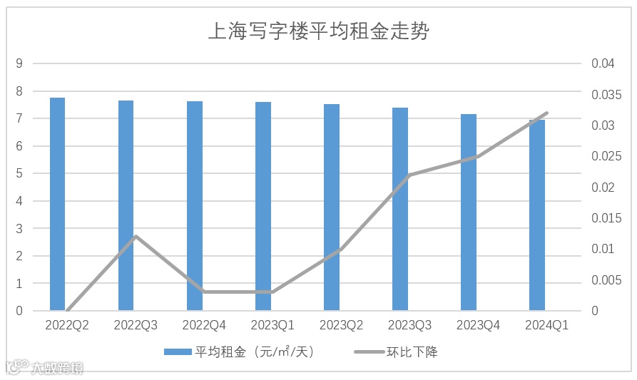 2024年第一季度,新兴商圈为上海新增10万平方米以上的甲级写字楼办公空间,净吸纳量超过9万平方米,其中,徐汇、长宁商圈表现突出。全市写字楼整体租金环比降至人民币6.9元每平方米/天,空置率环比略微下调,降至15.77%。
