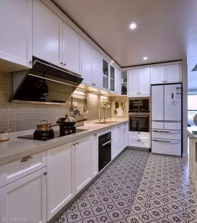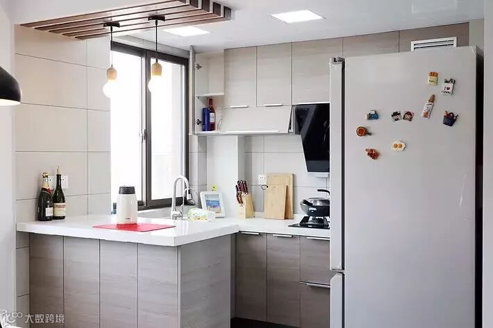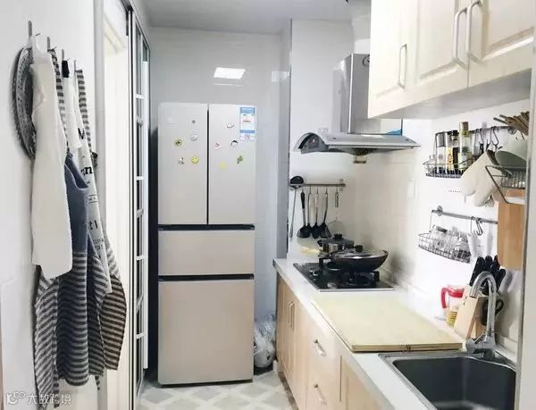 把冰箱“安装”到橱柜里面去,这就要求定做橱柜的时候,提前为冰箱预留出尺寸,看到下图了吗?冰箱显得会有点唐突,但好在橱柜有点连贯性,也可以解决一部分收纳问题。如下面几个案例: