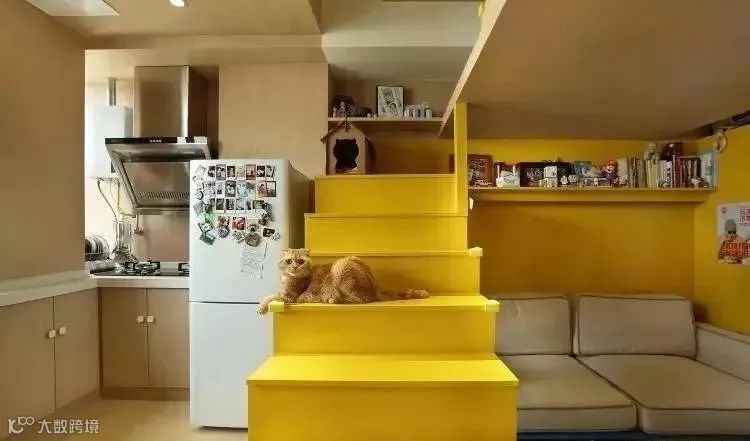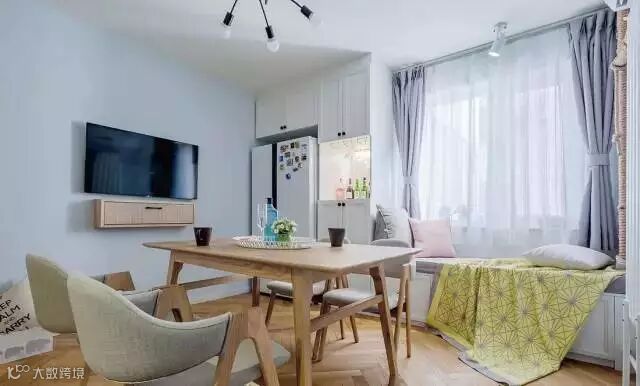 冰箱与柜体合为一体,相当节省空间。靠窗的地方的做了个榻榻米,等饭之余,靠着读几页书也是挺不错的。