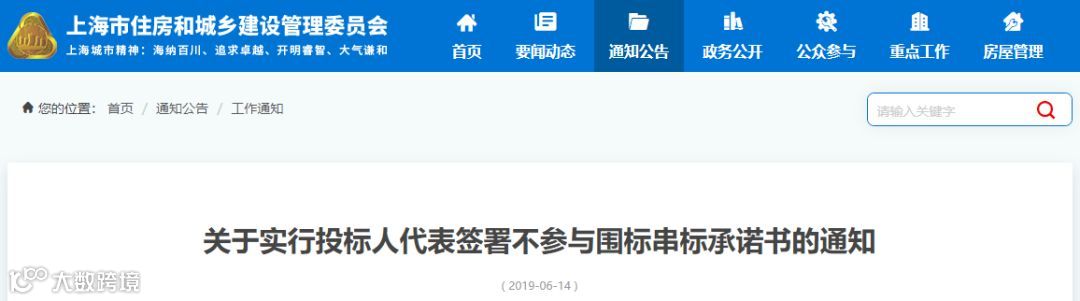 近日,上海市住建委下发《关于实行投标人代表签署不参与围标串标承诺书的通知》: