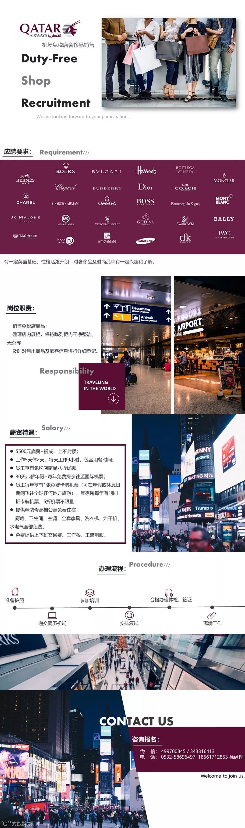卡塔尔航空公司于1993年,卡塔尔政府和个人投资者各占50%股份,总部位于多哈,也就是即将迎来2020年世界杯足球才的举办地。多哈机场建有4万平米免税奢侈品店,现面向全球招聘优秀奢侈品销售员。