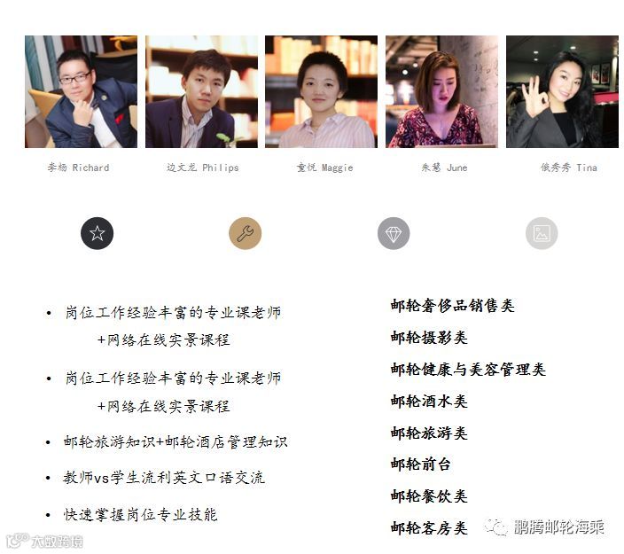 所有教师全部为邮轮专业及旅游、酒店培训专业,具有至少3年以上海外实际工作经验。
