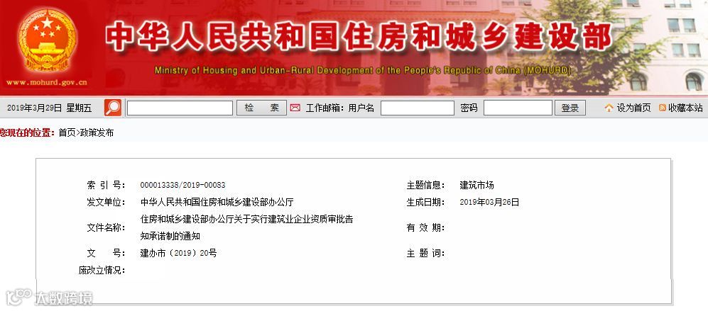 刚刚,住建部办公厅发布《关于实行建筑业企业资质审批告知承诺制的通知》,明确自2019年4月1日起,在全国范围对建筑工程、市政公用工程施工总承包一级资质审批实行告知承诺制。
