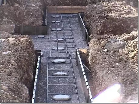 现浇钢筋混凝土基础局部,白色塑料圆环,起固定控制钢筋位置的作用