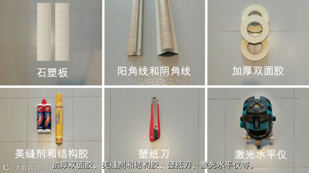 石塑板、阳角线、阴角线、加厚双面胶、美缝剂和结构胶、壁纸刀、激光水平仪等