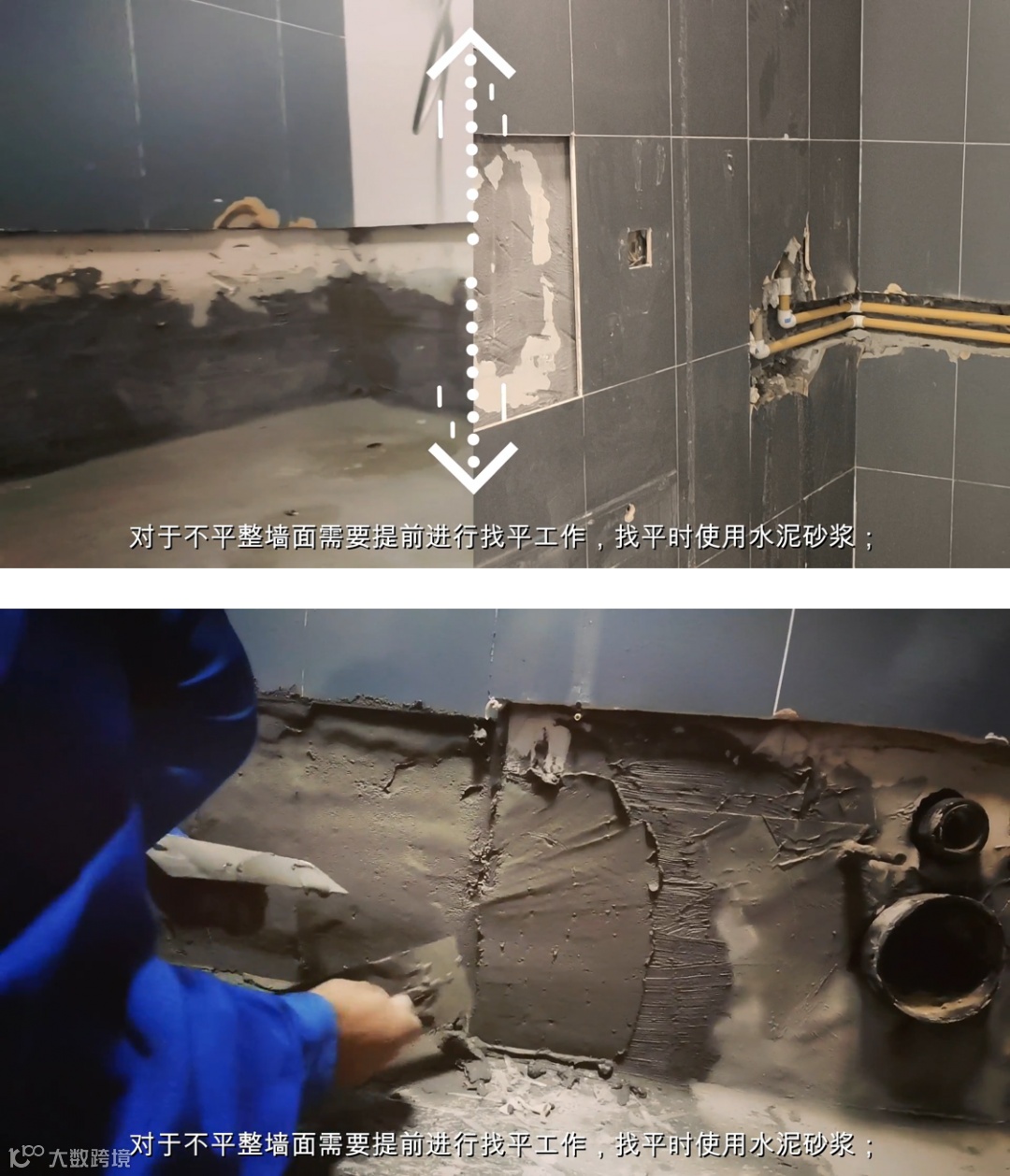 对破损及起鼓墙砖进行拆除,不平整墙面照片。