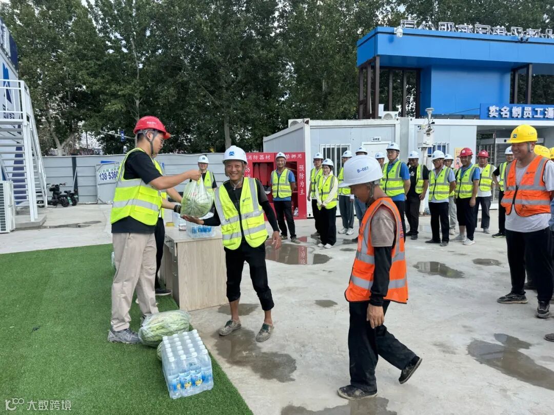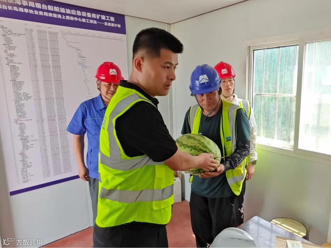 山东海事局长岛项目部在项目经理的带领下,组织开展“夏日送清凉”慰问活动,为奋战在高温一线的施工人员送去藿香正气水、清凉饮料、西瓜等防暑物资,传递项目部对劳动者的深切关怀。