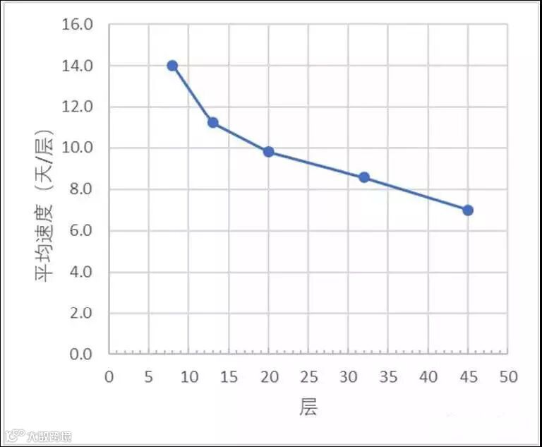 ▲日本框架结构超高层住宅(48+2层)施工速度统计
