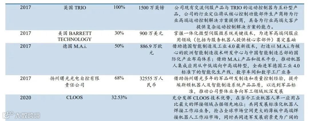 下游领域拓展方面,公司于2016年收购上海普莱克斯,快速推动了公司机器人本体在压铸行业的应用,提升公司产品在压铸机自动化市场的竞争力;2017年,公司收购德国M.A.i.,有利于借助其产品和技术平台,推动机器人集成应用从中低端向中高端转型;2020年公司完成Cloos公司的并购重组,强化公司焊接机器人优势细分业务,未来将继续保持Cloos在中厚板焊接市场的领先优势,共同发展前景广阔的机器人激光焊接、激光3D打印市场。