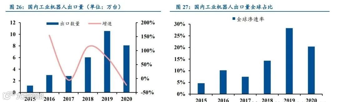 2015-2020年,国内工业机器人出口量由2015年的1.2万台提升至2020年的8.1万台,CAGR达46.5%;出口量在全球占比由4.6%提升至20.4%,增长约16个百分点。