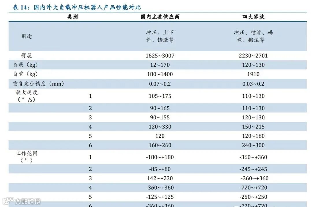 在覆盖范围方面,国内主要供应商机器人可实现1440mm-2010mm,与四大家族产品可实现的1200mm-2028mm大体相当。最高轴速方面,国内除了工业机器人龙头可达约700°/s外,大部分工业机器人的最高轴速与海外品牌仍存在一定差距。