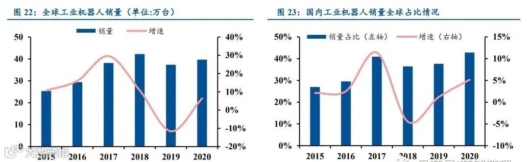 2018-2019年,国内工业机器人销量增速相对放缓,于2018年达到增速最低点-1.4%,主要因为政策补贴的大幅减少以及贸易摩擦的影响,下游需求持续低迷;2020下半年以来,受益于制造业的回暖和产业升级,国内工业机器人行业景气度持续回暖,全年实现产销分别为23.7万和17万台,同比分别增长约27%和21%。