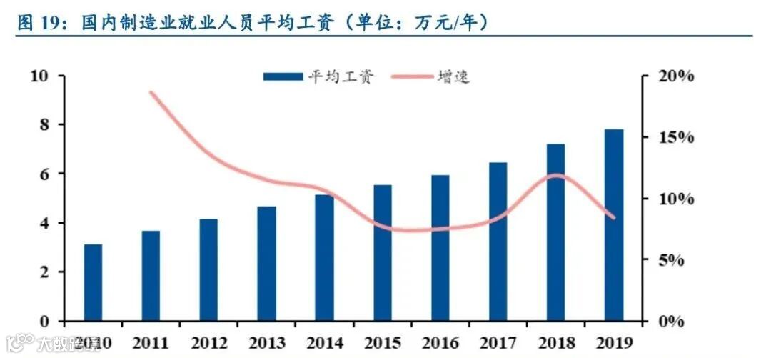 国内制造业就业人员平均工资由2010年的3.1万元提升至2019年的7.8万元,CAGR达10.8%,呈逐年递增趋势。国内人口红利褪去,劳动力成本逐年上升,下游企业自动化升级需求进一步提升,人工替代有望加速。