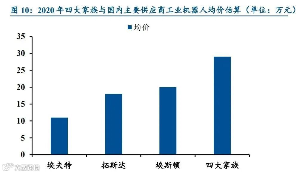 2020年,四大家族在国内机器人售价高于同类型国产工业机器人售价约40%以上。我们认为,目前国产工业机器人整体规模仍较小,未来随着行业的快速发展以及国产品牌渗透率的持续提升,国内供应商规模优势将逐步体现,成本端仍有下降空间。