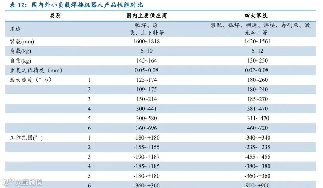 在小负载焊接领域,国产工业机器人的重复定位精度和覆盖范围已与“四大家族”产品相近,最高轴速上仍与海外品牌相比稍有差距。在重复定位精度方面,国产工业机器人可精确到0.05mm,与海外主要供应商的工业机器人精度相近,而与海外精度最高的机器人(0.02mm)相比仍有一定的进步空间。