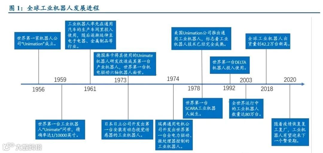 1956年,世界第一家机器人公司成立,随后世界第一台工业机器人于1959年诞生,并于1961年开始在美国的通用汽车公司安装运行;此后,工业机器人应用领域逐渐延伸至电子电器、金属制品、化学橡胶塑料等行业。