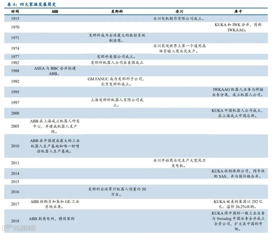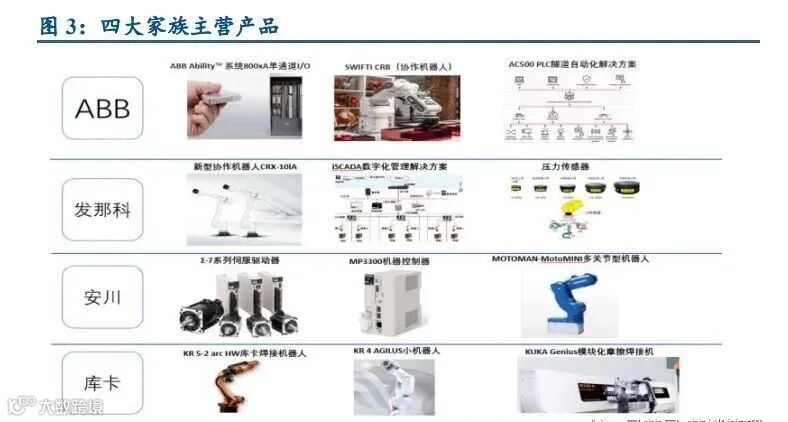 工业机器人领域中的四大家族为ABB、发那科、安川和库卡。