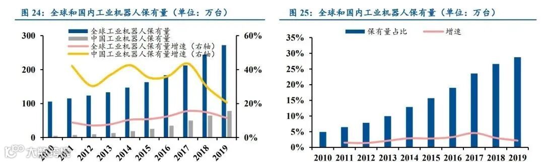 2010-2019年,全球工业机器人保有量从105.9万台增加至272.2万台,CAGR达 11.1%;国内工业机器人保有量从5.2万台增加至78.3万台,CAGR达35.2%,优于全球增速约24个百分点;国内工业机器人保有量全球占比从4.9%增加至28.8%,增长了24个百分点,呈逐年递增趋势。随着产业升级需求的不断提升以及支持政策的逐步落地,工业机器人下游产业对自动化设备需求增加,国内工业机器人保有量在全球占比有望持续提升。