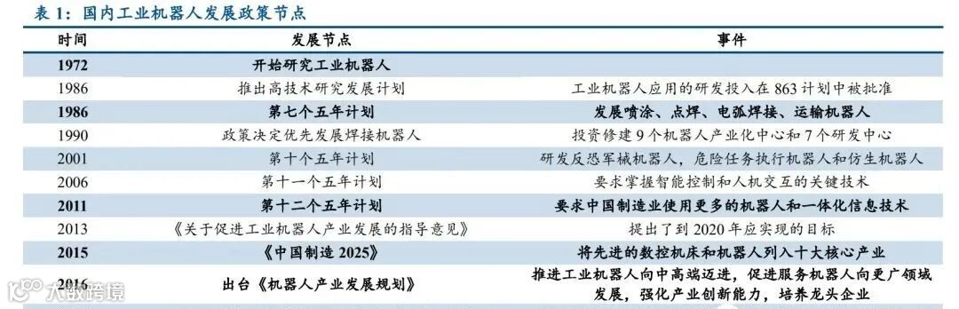 1986年3月国家推出高技术研究发展计划,大力支持机器人相关研发,“七五”规划(1986-1990年)推动了喷涂、点焊、电弧焊接、运输机器人等工业机器人的研发。