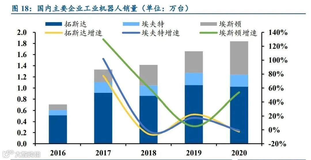 2020年,国内主要工业机器人供应商实现营收和业绩约64亿元和4.8亿元,同比分别上升47.1%和128.5%;埃斯顿实现营收25.1亿元,同比上升76.6%,营收优于行业增速约30个百分点。
