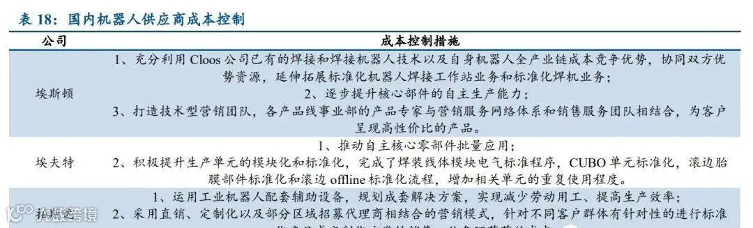 国产品牌的主要优势包括:1)本土化优势:国产工业机器人供应商在国内拥有完善的营销网络和售后服务体系,客户享有更高效、便捷的服务;2)成本控制优势:海外供应商在进口关税和经销商布局等方面成本仍较高;此外,国内品牌逐渐形成规模效应后,对上游议价能力增强,成本控制能力有望进一步提升;3)全产业链优势:国内工业机器人供应商不断通过“自主研发+外延并购”完善技术体系、提升核心零部件自制率,逐步形成全产业链优势。