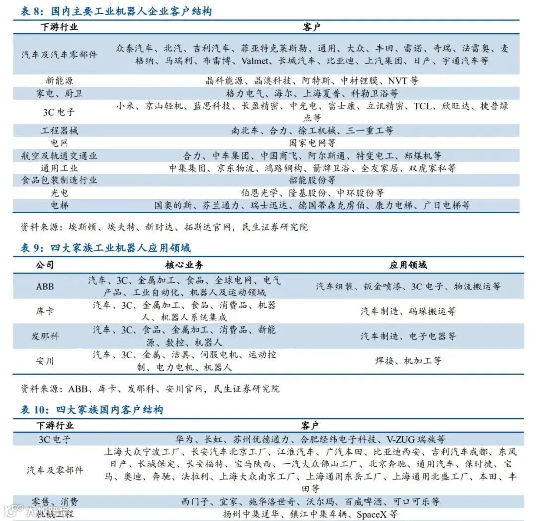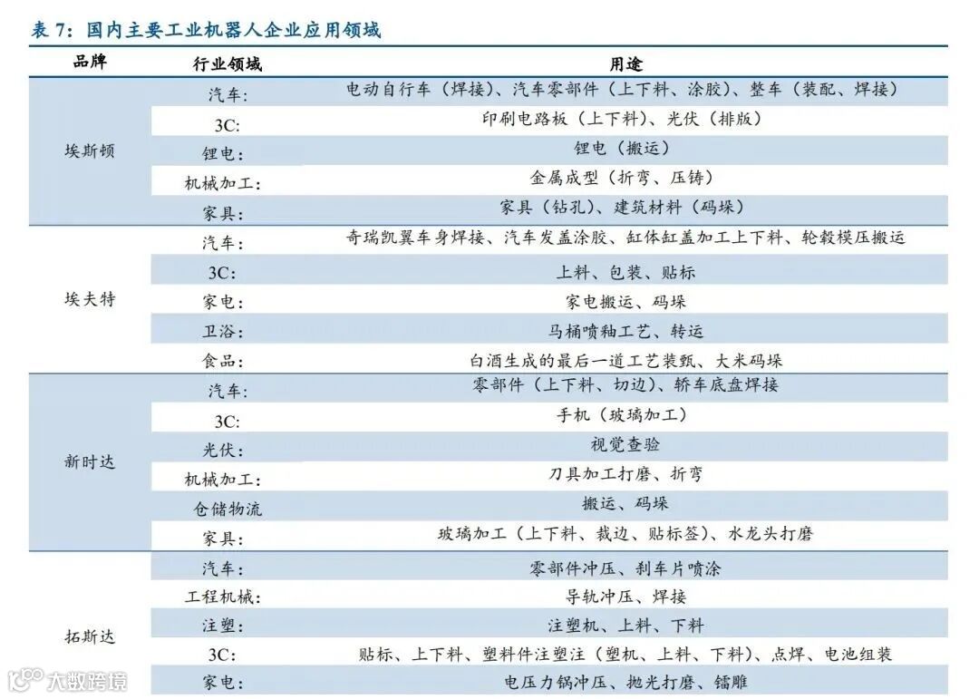 细分领域龙头初现:目前汽车行业仍为国内外工业机器人供应商下游主要的应用领域;其中海外品牌下游主要应用于汽车整车,国内品牌主要提供冲压、焊接、喷涂、包装等汽车行业细分领域的机器人产品。